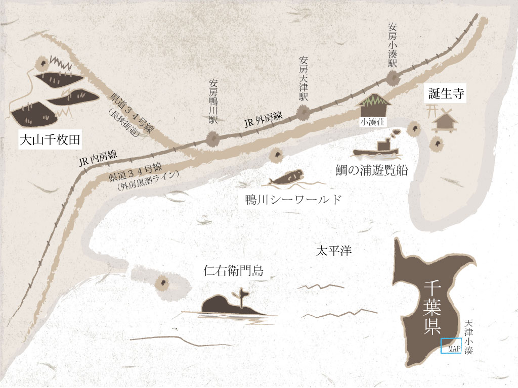 日蓮宗の開祖・日蓮聖人の生誕地に建つ、 由緒ある歴史寺院。 朱塗りの仁王門や本堂、祖師堂が立ち並び、 自然と調和した景色が広がります。 小湊の歴史と文化にふれる、静かで落ち 着いたひとときを楽しめます。 る静かなひとときを楽しめます。